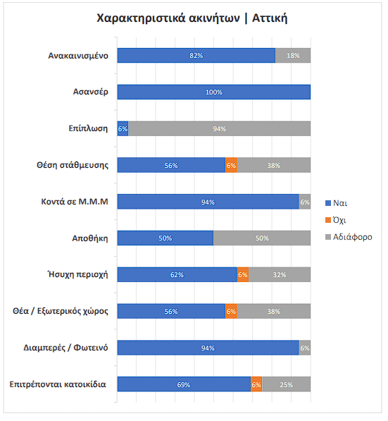 Στα χαρακτηριστικά των ακινήτων, οι περισσότεροι ενοικιαστές στην Αττική αναζητούν διαμερίσματα διαμπερή και φωτεινά σε ποσοστό 94%, σε ήσυχες περιοχές σε ποσοστό 62%, την ύπαρξη εξωτερικού χώρου ή θέας και χώρου στάθμευσης (56%). Η ανακαίνιση είναι ζητούμενο για το 82% των ενοικιαστών, ενώ ιδιαίτερη σημασία δίνεται και στα κουφώματα, με το 69% να προτιμά κουφώματα αλουμινίου και το 25% νέας τεχνολογίας (PVC κ.λπ.). Στη θέρμανση, το 75% ζητά φυσικό αέριο, ενώ το ενδιαφέρον για Smart Home αυτοματισμούς παραμένει σχετικά περιορισμένο (19% επιθυμητό, 81% αδιάφορο).Τέλος, η πρόσβαση σε μέσα μαζικής μεταφοράς παραμένει βασική προτεραιότητα για το 94% των ενοικιαστών.