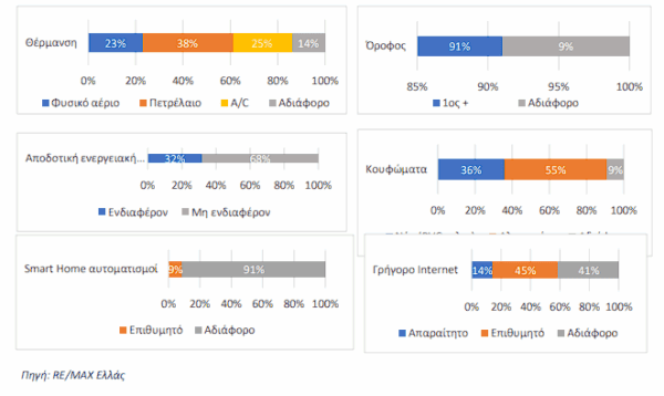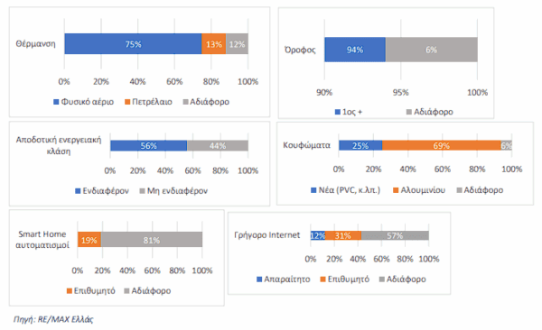 Ενδιαφέρον στοιχείο αποτελεί, επίσης, το γεγονός ότι οι ενδιαφερόμενοι ενοικιαστές, σε πανελλαδικό επίπεδο, αναζητούν κατοικίες φωτεινές και διαμπερείς, να είναι κοντά σε στάσεις Μέσων Μαζικής Μεταφοράς (ιδιαίτερα στα μεγάλα αστικά κέντρα), να διαθέτουν θέσεις στάθμευσης, αλλά και να διευκολύνεται η φιλοξενία των κατοικιδίων τους. Για παροχές τεχνολογίας, οι περισσότεροι ενοικιαστές εμφανίζονται αδιάφοροι για τους λεγόμενους «έξυπνους» αυτοματισμούς, παρότι αυξάνεται η ζήτηση για ανακαινισμένα ακίνητα. Επίσης, η θέρμανση με φυσικό αέριο είναι κυρίαρχη σε Αττική και Θεσσαλονίκη, ενώ στην Περιφέρεια εξακολουθούν να χρησιμοποιούνται σε μεγάλο βαθμό το πετρέλαιο, αλλά και τα κλιματιστικά.