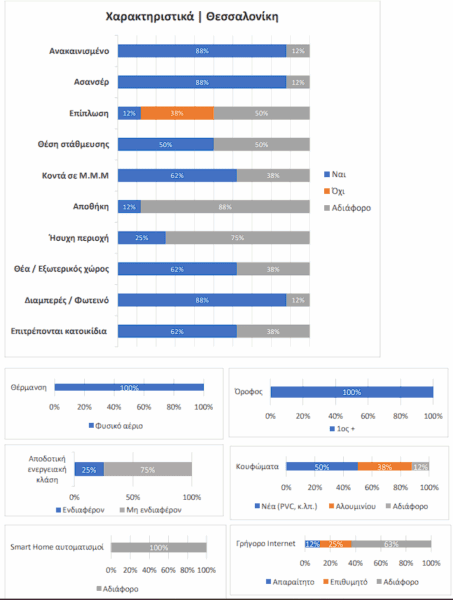 Στα ποιοτικά χαρακτηριστικά, το 88% των ενοικιαστών ζητά διαμπερή και φωτεινά σπίτια, ενώ ποσοστό 62% δίνει έμφαση σε θέα ή εξωτερικό χώρο και στην εγγύτητα σε μέσα μαζικής μεταφοράς. Η ήσυχη περιοχή φαίνεται να αποτελεί προτεραιότητα μόνο για το 25% των ενοικιαστών. Η ύπαρξη αποθήκης απασχολεί περιορισμένο ποσοστό ενδιαφερόμενων ενοικιαστών (12%), ενώ στην επίπλωση υπάρχει ποικιλία στις επιλογές: το 50% ζητά ακίνητο χωρίς επίπλωση, το 12% επιπλωμένο, ενώ το 38% δηλώνει αδιάφορο για το αν το ακίνητο είναι ή όχι επιπλωμένο. Η θέρμανση με φυσικό αέριο είναι καθολικά ζητούμενο στη Θεσσαλονίκη σε ποσοστό 100%.