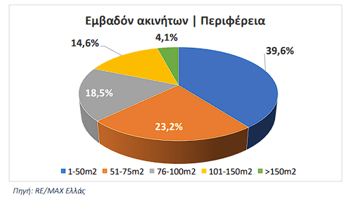Στην υπόλοιπη Ελλάδα, σύμφωνα με τη RE/MAXΕλλάς, οι μισθώσεις αφορούν κυρίως μικρά και μεσαία ακίνητα, με το 39,6% των ενοικιάσεων να αφορά κατοικίες έως 50 τ.μ. και το 23,2% ακίνητα από 51 έως 75 τετραγωνικά μέτρα. Οι μισθώσεις σε κατοικίες από 76 έως 150 τ.μ. φτάνουν αθροιστικά το 33,1%, ενώ το ποσοστό των ακινήτων άνω των 151 τ.μ. είναι περιορισμένο (4,1%).