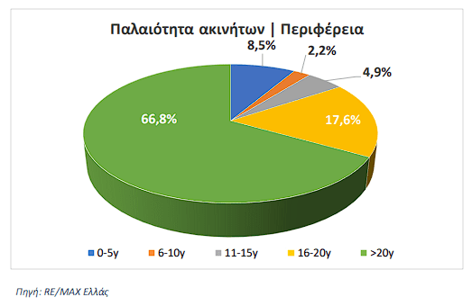 Η παλαιότητα των ακινήτων στην Περιφέρεια είναι γενικά μικρότερη σε σύγκριση με την Αττική και τη Θεσσαλονίκη. Παρότι το 66,8% των μισθώσεων αφορά κατοικίες άνω των 20 ετών, υπάρχει και ένα σημαντικό ποσοστό νεότερων ακινήτων. Συγκεκριμένα, το 17,6% των μισθώσεων αφορά κατοικίες ηλικίας 16 έως 20 ετών, ενώ ένα επιπλέον 15,6% αφορά ακίνητα έως 15 ετών.