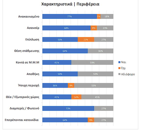Όσον αφορά στα χαρακτηριστικά, οι ενοικιαστές ζητούν κυρίως διαμπερή και φωτεινά ακίνητα (73%), ενώ η ανακαίνιση φαίνεται να αποτελεί ζητούμενο για το 77%. Η ύπαρξη θέσης στάθμευσης είναι σημαντική για το 64% των ενοικιαστών και οι χώροι αποθήκευσης για έναν στους δύο.
