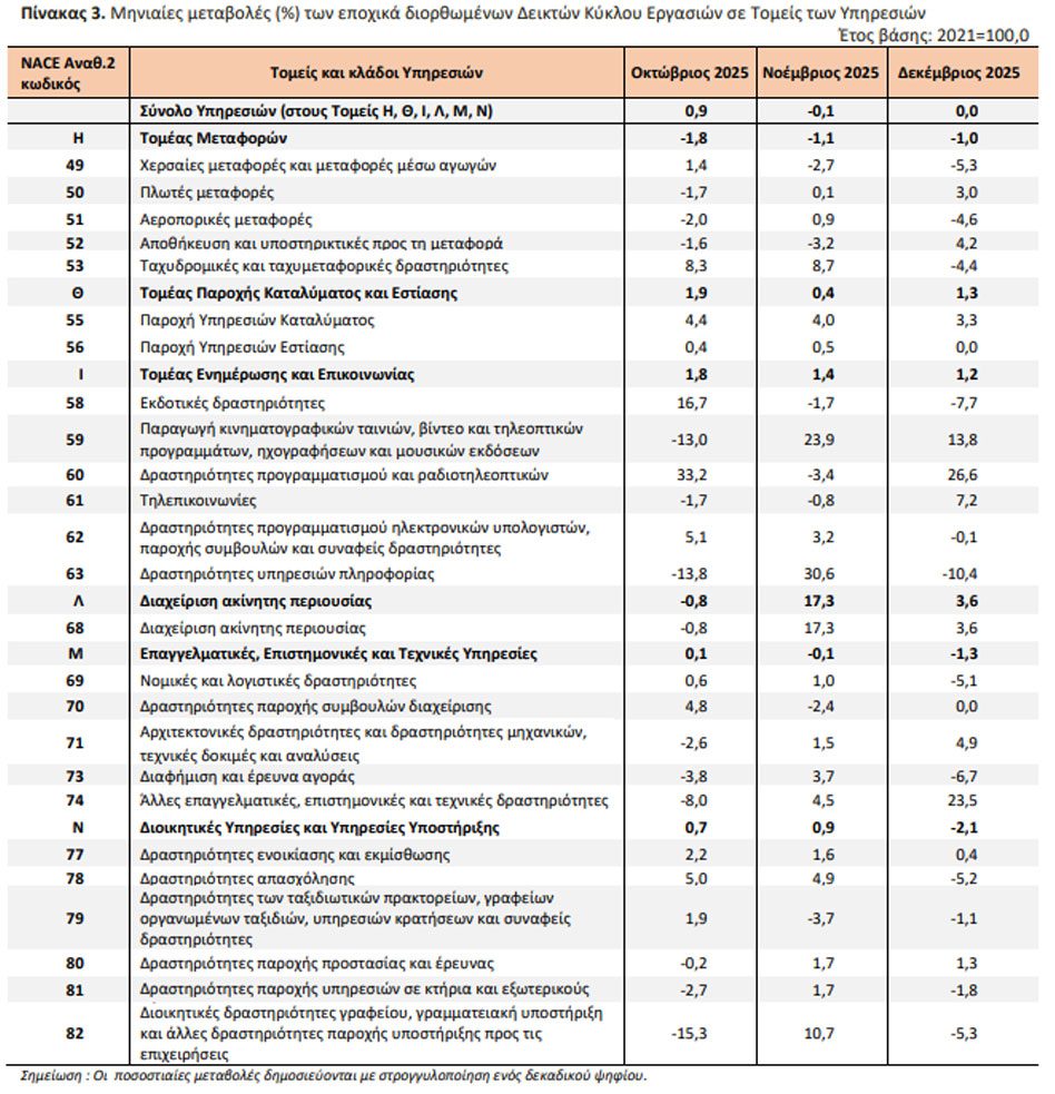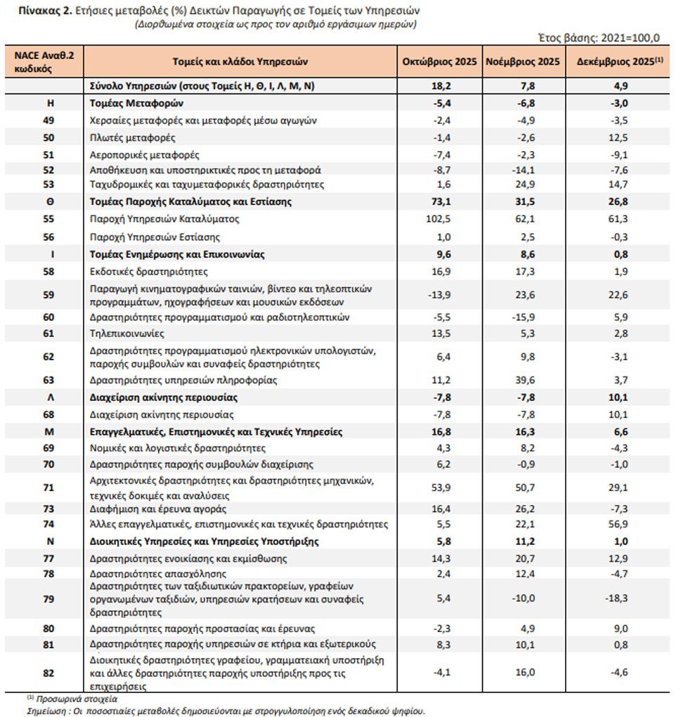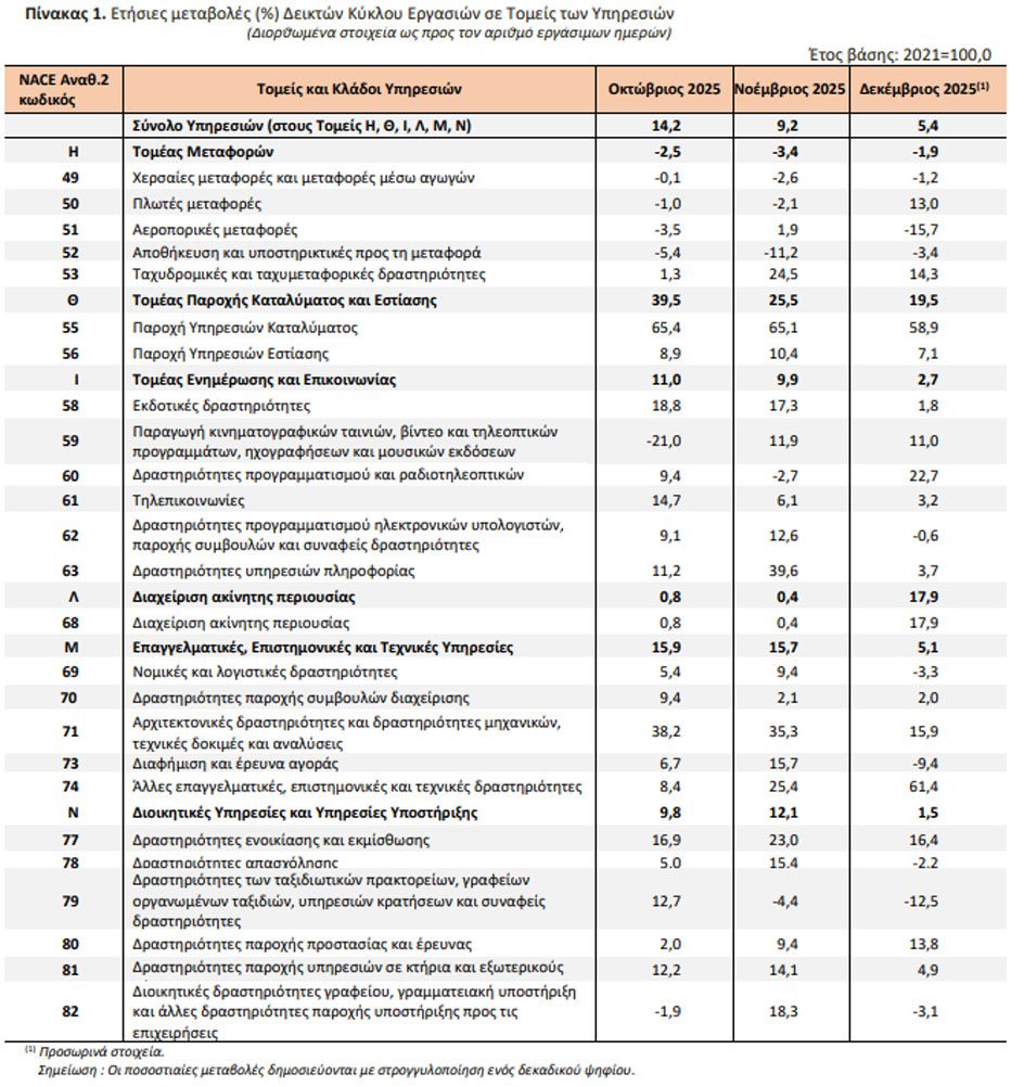 Σημαντική αύξηση της δραστηριότητας στους περισσότερους τομείς των υπηρεσιών καταγράφουν τα προσωρινά στοιχεία της Ελληνικής Στατιστικής Αρχής (ΕΛΣΤΑΤ) για το διάστημα Οκτωβρίου – Δεκεμβρίου 2025.