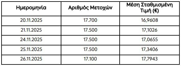 Η Δημόσια Επιχείρηση Ηλεκτρισμού Α.Ε. («ΔΕΗ»), ανακοίνωσε ότι, στο πλαίσιο του προγράμματος επαναγοράς μέχρι και 36.927.000 μετοχών εκδόσεώς της (οι «Ίδιες Μετοχές»), κατά το χρονικό διάστημα από 20.11.2025 μέχρι και 26.11.2025, αγόρασε μέσω συναλλαγών στο Χρηματιστήριο Αθηνών συνολικά 87.300 Ίδιες Μετοχές, ως εξής:
