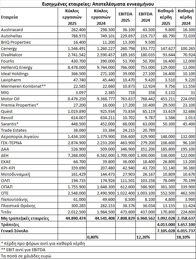 Συνολικά, οι 35 εισηγμένες παρουσίασαν καθαρή κερδοφορία ύψους 7,1 δισ. ευρώ, υψηλότερη κατά 18% σε σύγκριση με την αντίστοιχη περυσινή περίοδο.