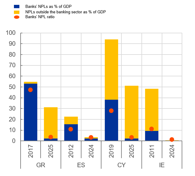 Σημειώσεις: Η πρώτη ημερομηνία για κάθε χώρα αντιστοιχεί στο πρώτο έτος κατά το οποίο τα μη εξυπηρετούμενα δάνεια (NPL) άρχισαν να μεταφέρονται εκτός του τραπεζικού τομέα. Τα μη εξυπηρετούμενα δάνεια (NPL) εκτός του τραπεζικού τομέα κατέχονται από την Nama στην Ιρλανδία, την Kedipes στην Κύπρο, την Sareb στην Ισπανία και διάφορες εταιρείες εξυπηρέτησης δανείων στην Ελλάδα. Δεν υπάρχουν διαθέσιμα στοιχεία για την Πορτογαλία. Για την Ιρλανδία, χρησιμοποιείται το ΑΕΠ* αντί του ΑΕΠ. Για το 2025, τα στοιχεία για την Ελλάδα και την Κύπρο αναφέρονται στον Σεπτέμβριο και τον Δεκέμβριο, αντίστοιχα. Για την Ιρλανδία και την Ισπανία, τα στοιχεία για το 2025 για τα μη εξυπηρετούμενα δάνεια στη Nama και τη Sareb δεν ήταν ακόμη διαθέσιμα κατά τη δημοσίευση αυτού του ιστολογίου.