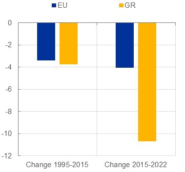 Υπάρχουν ενδείξεις διαρθρωτικής βελτίωσης της εξαγωγικής ικανότητας, η οποία υποστηρίζεται από τη μείωση των εμποδίων στο εμπόριο και τις διαρθρωτικές μεταρρυθμίσεις. Η ανάλυσή μας δείχνει ότι τα εμπορικά εμπόδια μεταξύ της Ελλάδας και άλλων χωρών της ΕΕ είχαν μειωθεί περίπου κατά το ίδιο ποσοστό όπως και στην ΕΕ στο σύνολό της στις δύο δεκαετίες έως το 2015 (Διάγραμμα 3).Ωστόσο, από το 2015, έχουν μειωθεί περίπου κατά διπλάσιο ποσοστό, εν μέρει αντανακλώντας τις μεταρρυθμίσεις που εφαρμόστηκαν στο πλαίσιο των προγραμμάτων προσαρμογής. Αυτές περιελάμβαναν την απλούστευση της αδειοδότησης επιχειρήσεων, τον εξορθολογισμό των τελωνειακών διαδικασιών και των λιμενικών εργασιών και τη μείωση των κανονιστικών φραγμών, τα οποία μείωσαν το κόστος και τον χρόνο που απαιτούνταν για το εμπόριο.