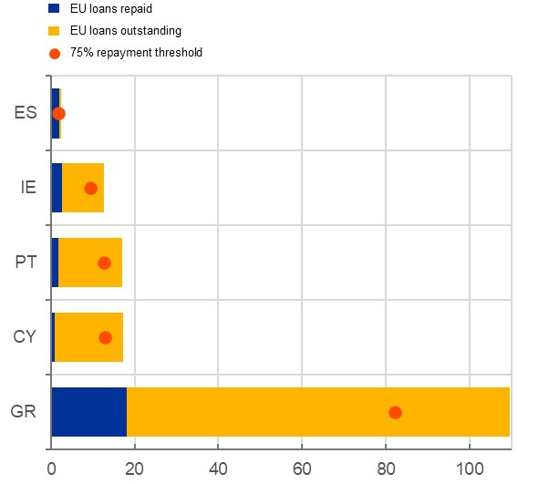 Σημειώσεις: Η Ισπανία είναι η μόνη χώρα που έχει μέχρι στιγμής ξεπεράσει το όριο αποπληρωμής του 75%. Για την Ιρλανδία, χρησιμοποιείται το ΑΕΠ* αντί για το ΑΕΠ.