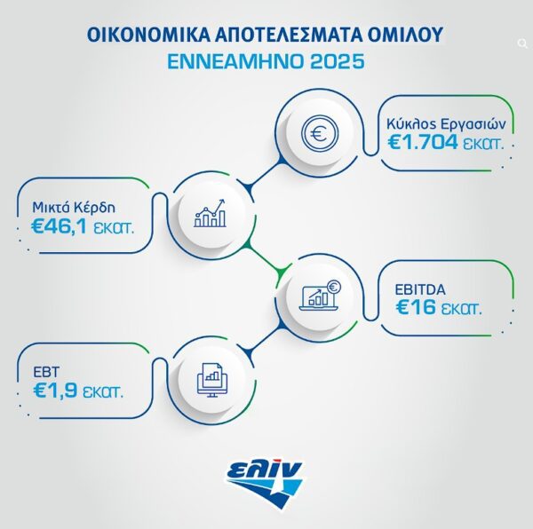 Ο ενοποιημένος κύκλος εργασιών του Ομίλου ελίν κατά το 9μηνο του 2025 ανήλθε σε €1.704,71 εκατ. έναντι €2.050,64 εκατ. του 9μήνου του 2024, καταγράφοντας μείωση 17%, γνωστοποιεί η εισηγμένη.