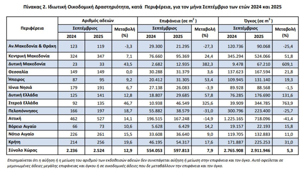 Οι εκδοθείσες άδειες Ιδιωτικής Οικοδομικής Δραστηριότητας, στο σύνολο της Χώρας, κατά τον μήνα Σεπτέμβριο 2025 ανήλθαν σε 2.524 οικοδομικές άδειες, που αντιστοιχούν σε 597.813 m2 επιφάνειας και 2.911.946 m3 όγκου, παρουσιάζοντας αύξηση κατά 12,9% στον αριθμό των οικοδομικών αδειών, αύξηση κατά 7,9% στην επιφάνεια και αύξηση κατά 5,3% στον όγκο, σε σχέση με τον αντίστοιχο μήνα του 2024.