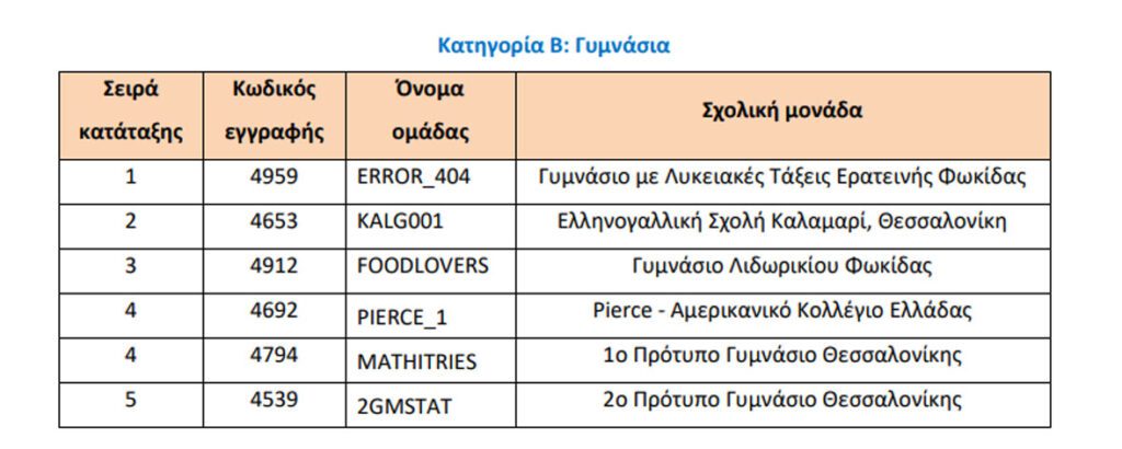 Σύμφωνα με τα ανωτέρω αποτελέσματα, δύο ομάδες ισοβάθμησαν στην τρίτη θέση στην κατηγορία των Λυκείων και δύο ομάδες στην τέταρτη θέση των Γυμνασίων.