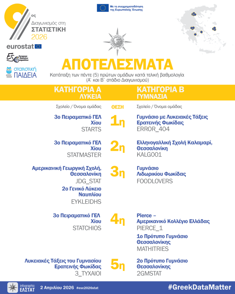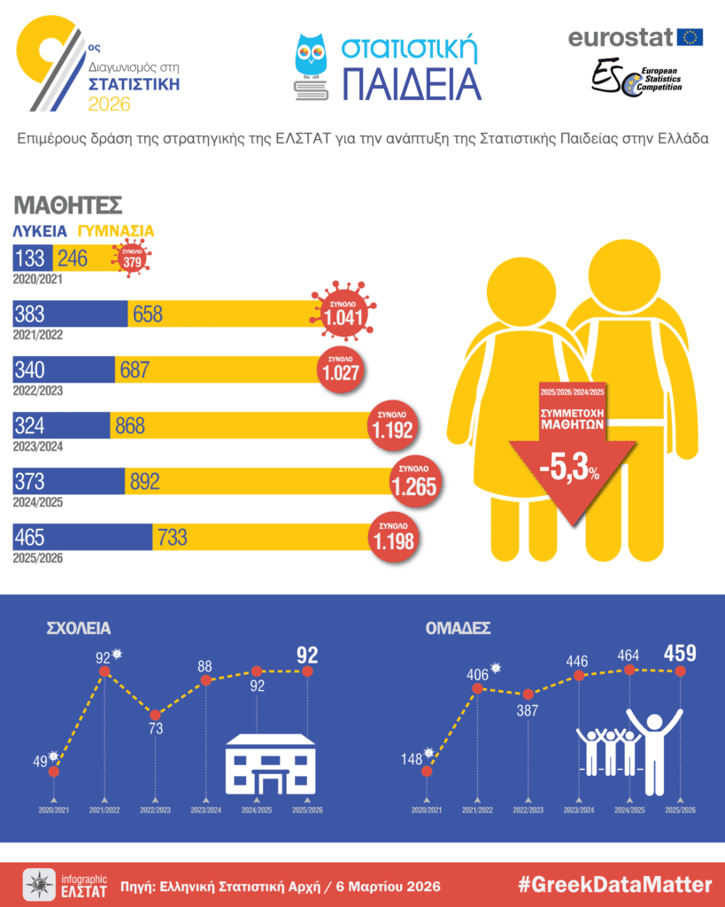 Η Ελληνική Στατιστική Αρχή (ΕΛΣΤΑΤ), στο πλαίσιο της στρατηγικής της για την ανάπτυξη της Στατιστικής Παιδείας στην Ελλάδα, διοργάνωσε, για ένατη συνεχή χρονιά, τον «Πανελλήνιο Διαγωνισμό στη Στατιστική».