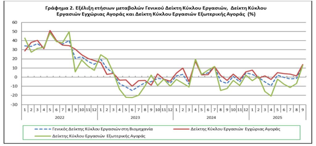 Ο Γενικός Δείκτης Κύκλου Εργασιών στη Βιομηχανία (σύνολο εγχώριας και εξωτερικής αγοράς) του μηνός Σεπτεμβρίου 2025, σε σύγκριση με τον αντίστοιχο δείκτη του Σεπτεμβρίου 2024, παρουσίασε αύξηση 13,4% έναντι μείωσης 6,9% που σημειώθηκε κατά την αντίστοιχη σύγκριση του έτους 2024 με το 2023.