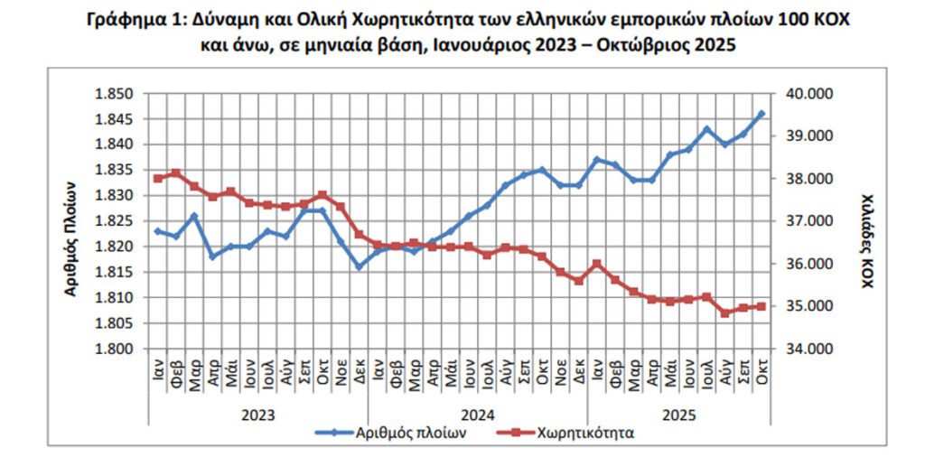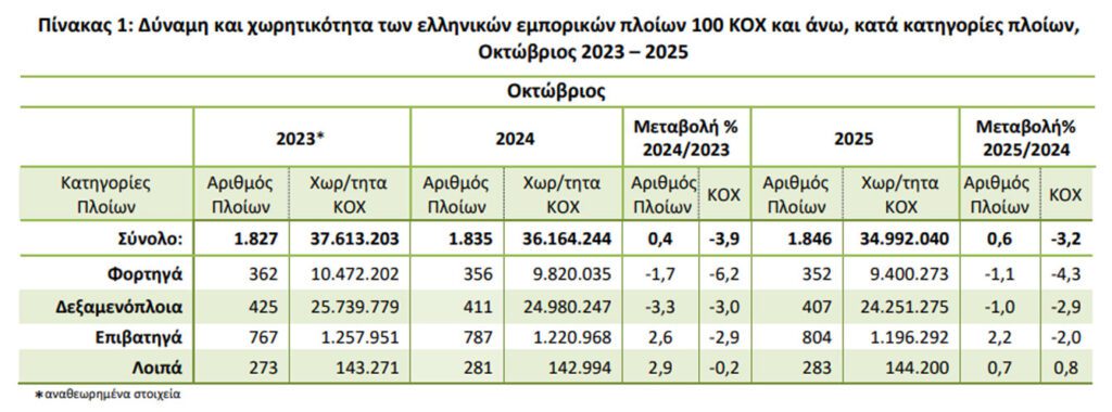 • Η Ολική Χωρητικότητα του Ελληνικού Εμπορικού Στόλου, από πλοία 100 ΚΟΧ και άνω, παρουσίασε μείωση κατά 3,2% τον μήνα Οκτώβριο 2025 σε σύγκριση με την αντίστοιχη χωρητικότητα του Οκτωβρίου 2024.