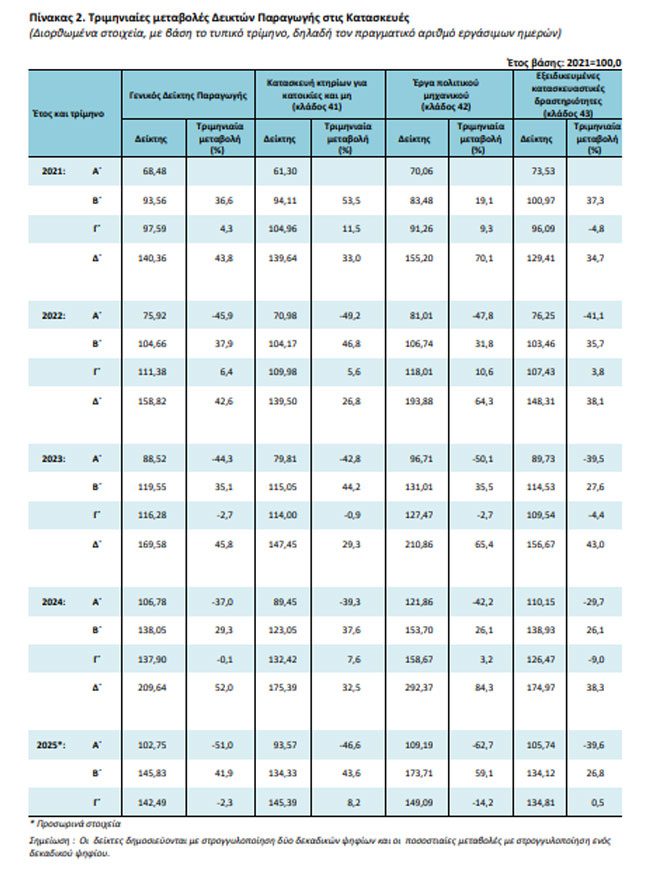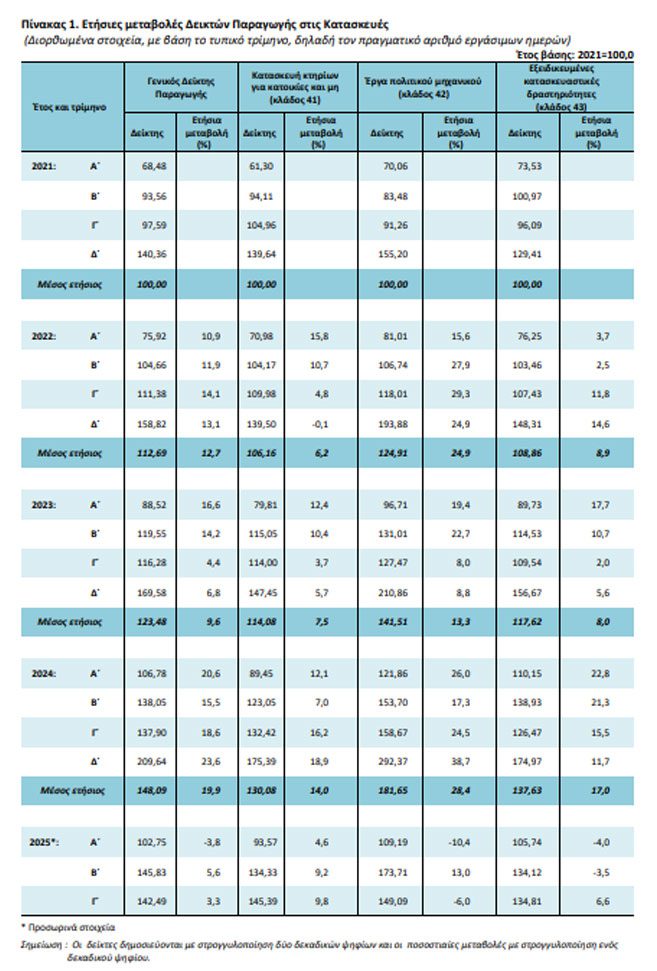 Η εξέλιξη του Δείκτη Παραγωγής στις Κατασκευές, με βάση τα στοιχεία της ΕΛΣΤΑΤ, με περίοδο αναφοράς το γ’ τρίμηνο 2025, σύμφωνα με προσωρινά και διορθωμένα ως προς το πλήθος των εργάσιμων ημερών στοιχεία, έχει ως εξής: