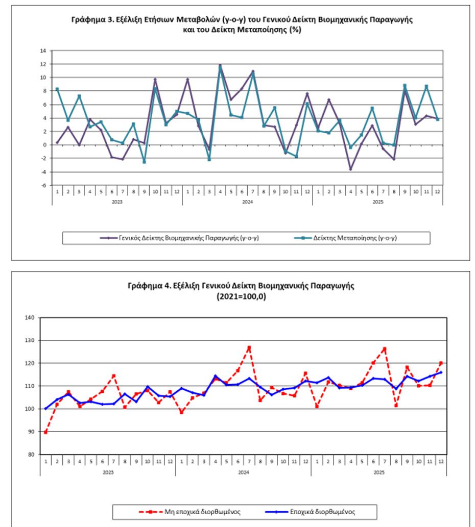 Ο Γενικός Δείκτης Βιομηχανικής Παραγωγής του μηνός Δεκεμβρίου 2025, σε σύγκριση με τον αντίστοιχο δείκτη του Δεκεμβρίου 2024, παρουσίασε αύξηση 3,9% έναντι αύξησης 7,7% που σημειώθηκε κατά την αντίστοιχη σύγκριση του έτους 2024 με το 2023.