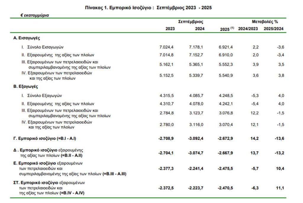 Η αντίστοιχη αξία χωρίς τα πετρελαιοειδή κατά τον μήνα Σεπτέμβριο 2025 παρουσίασε αύξηση του ελλείμματος κατά 234,1 εκατ. ευρώ, δηλαδή 10,4%, ενώ η αντίστοιχη αξία χωρίς τα πετρελαιοειδή και τα πλοία κατά τον μήνα Σεπτέμβριο 2025 παρουσίασε αύξηση κατά 246,8 εκατ. ευρώ, δηλαδή 11,1% σε σχέση με τον μήνα Σεπτέμβριο 2024.