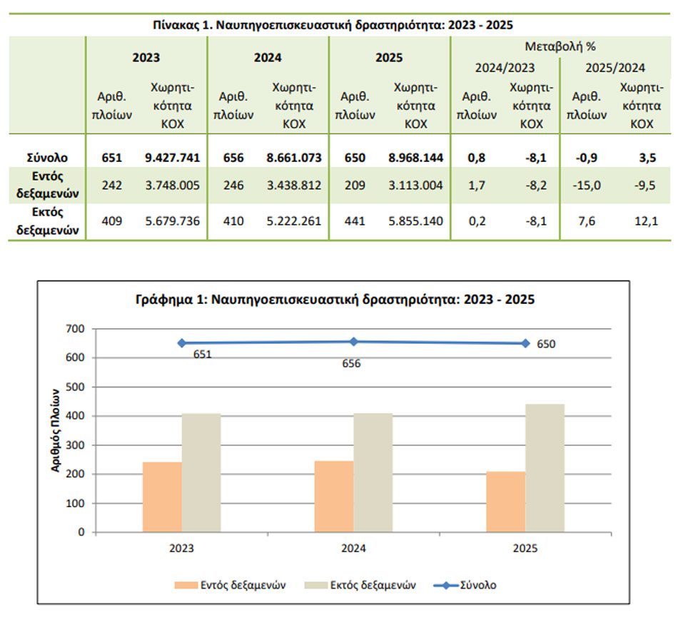 ▪ Ο αριθμός των πλοίων που επισκευάστηκαν εκτός δεξαμενών το έτος 2025 παρουσίασε αύξηση 7,6% και η ολική χωρητικότητά τους αύξηση 12,1%, σε σχέση με τα αντίστοιχα στοιχεία του έτους 2024. Ο αριθμός των πλοίων που επισκευάστηκαν εντός δεξαμενής κατά το 2025 παρουσίασε