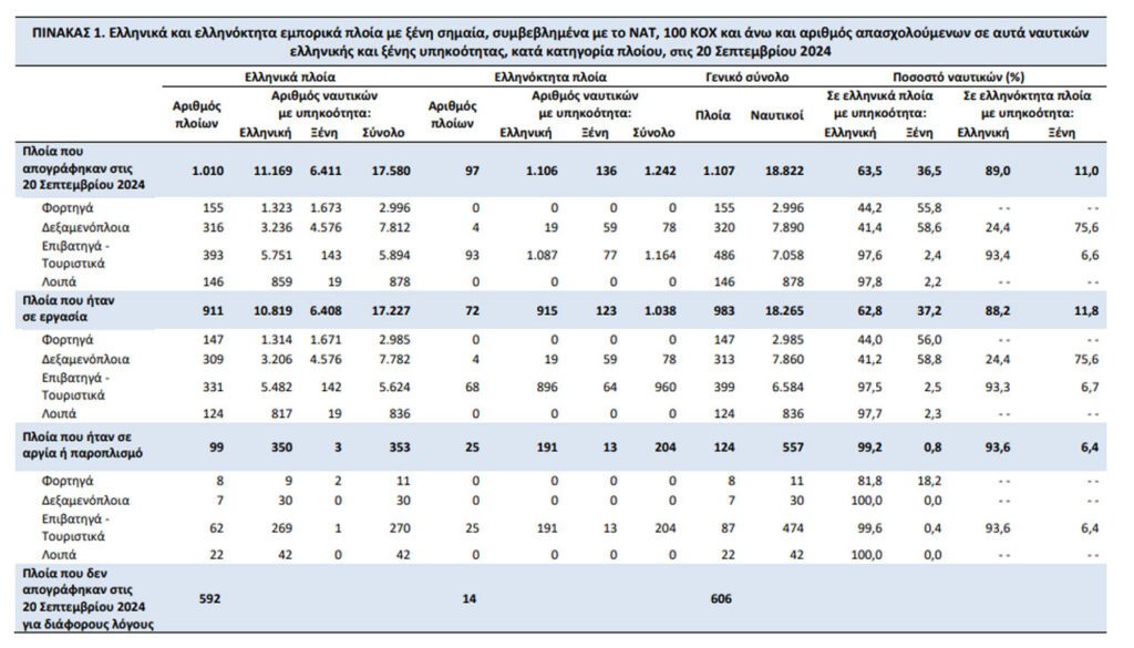 Από τη σύγκριση των στοιχείων της απογραφής του έτους 2024 με τα αντίστοιχα της προηγούμενης απογραφής του 2022, παρατηρείται ότι το σύνολο των ελληνικής και ξένης υπηκοότητας ναυτικών στα ελληνικά πλοία που απογράφηκαν (1.010 πλοία) αυξήθηκε κατά 1,9% και στα ελληνόκτητα πλοία με ξένη σημαία (97 πλοία) αυξήθηκε κατά 11,2%.