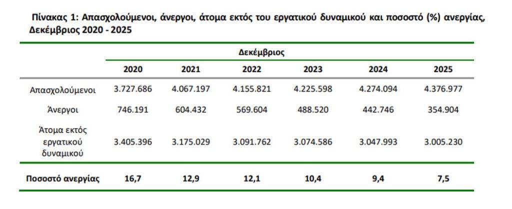 Οι άνεργοι ανήλθαν σε 354.904 άτομα σημειώνοντας μείωση κατά 87.842 άτομα σε σχέση με τον Δεκέμβριο του 2024 (-19,8%) και μείωση κατά 31.165 άτομα σε σχέση με τον Νοέμβριο του 2025 (-8,1%).