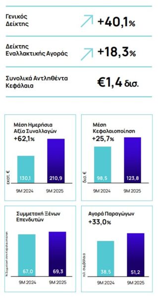 Ο Γενικός Δείκτης του Χρηματιστηρίου Αθηνών έκλεισε το εννεάμηνο 2025 αυξημένος κατά 40,1% συγκριτικά με το τέλος της αντίστοιχης περυσινής περιόδου