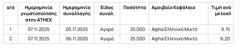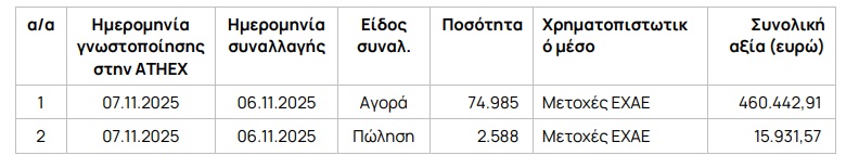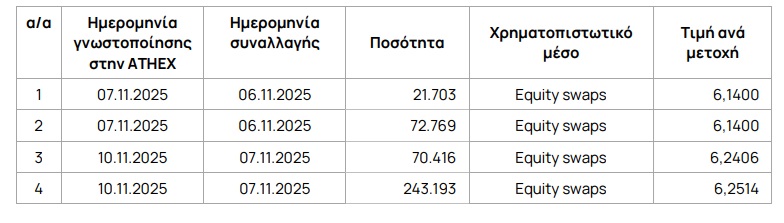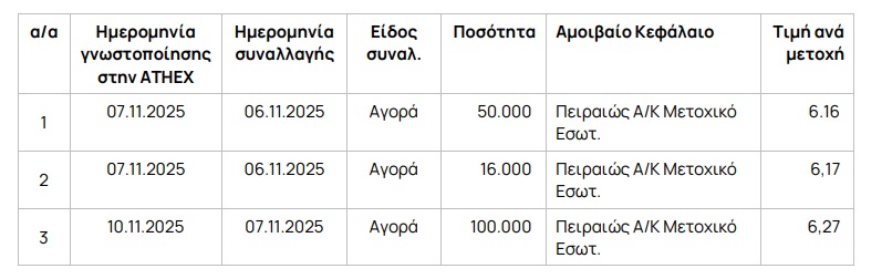 Μετά τις ανωτέρω συναλλαγές, τα υπό διαχείρισή της ΠΕΙΡΑΙΩΣ ASSET MANAGEMENT ΜΟΝΟΠΡΟΣΩΠΗ ΑΕΔΑΚ αμοιβαία κεφάλαια κατέχουν συνολικά το 3,69% των δικαιωμάτων ψήφου της Εταιρείας, από 3,41% που κατείχαν στις 05.11.2025.