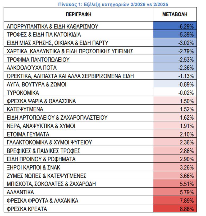 Τον Φεβρουάριο 2026 οι τιμές στα σούπερ μάρκετ αυξήθηκαν οριακά σε σχέση με πέρσι. Μειώσεις καταγράφονται σε απορρυπαντικά, τρόφιμα για κατοικίδια και είδη παντοπωλείου, ενώ αυξήσεις εμφανίζουν τα φρέσκα κρέατα, τα φρούτα και τα λαχανικά.