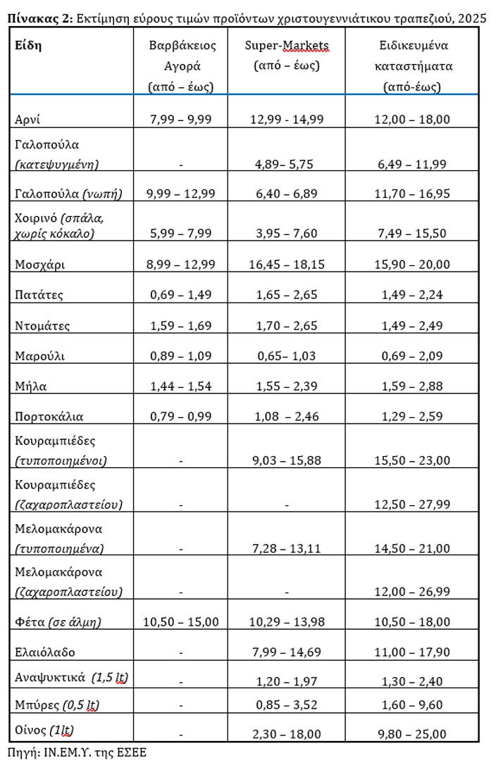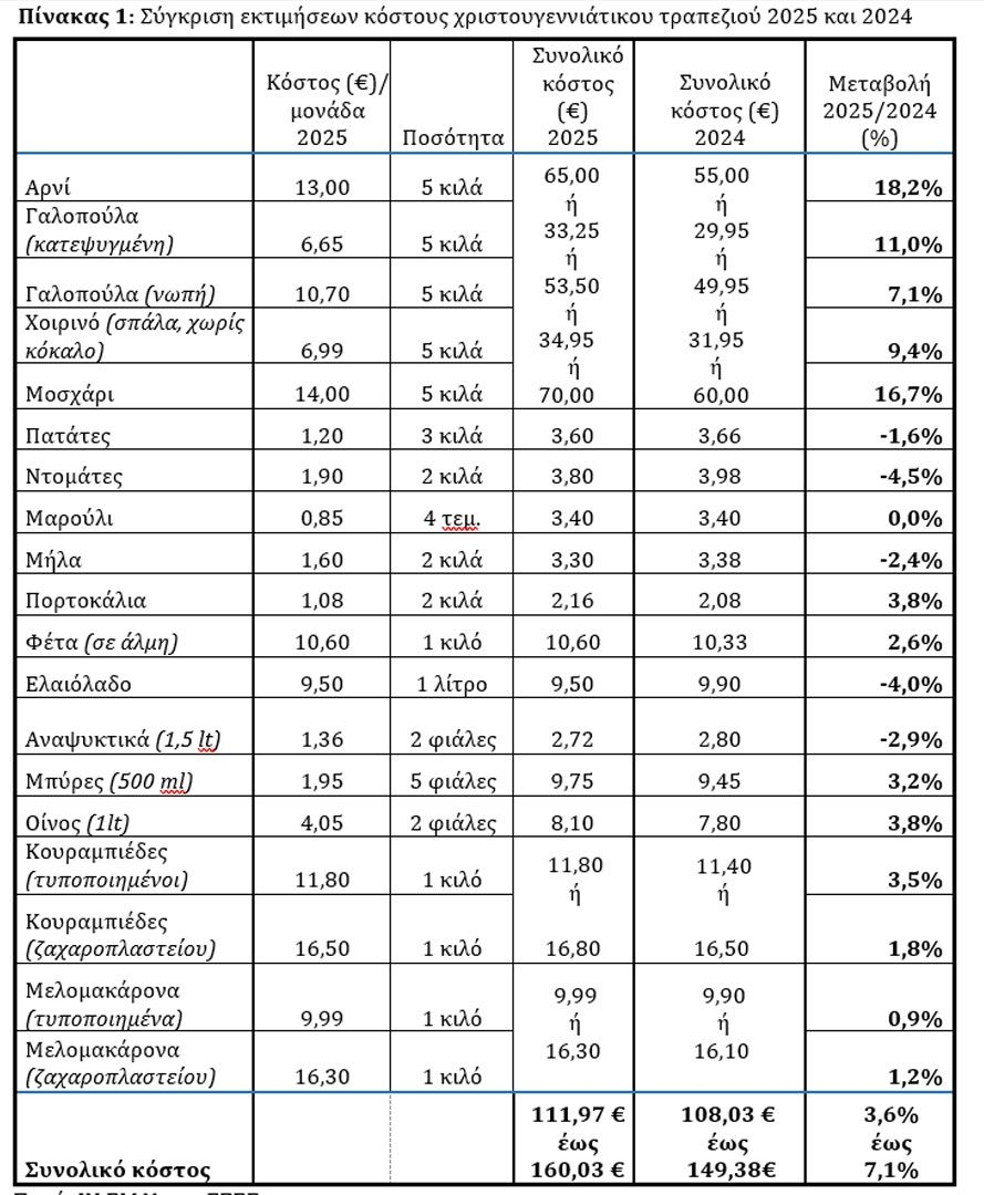 Όπως αναφέρει σε ανακοίνωση της η ΕΣΕΕ, πρόκειται για μεταβολή της τάξης του 3,6% έως 7,1% σε σύγκριση με το αντίστοιχο τραπέζι του 2024.