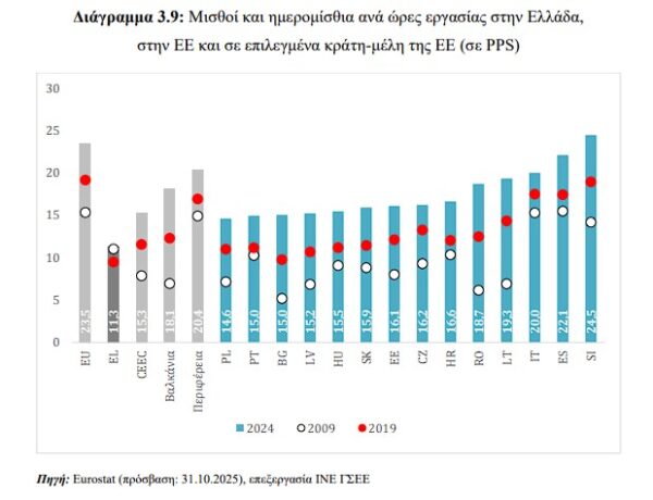 Η εικόνα παραμένει εξίσου προβληματική, σε ότι αφορά τις συνολικές αποδοχές των μισθωτών με τις ώρες εργασίας τους. Ειδικότερα, το μέσο ωρομίσθιο των εργαζομένων σε όρους PPS ανερχόταν το 2024 στη χώρα μας σε 11,3, όταν στις χώρες της Κεντρικής και Ανατολικής Ευρώπης ήταν 15,3, στα κράτη-μέλη των Βαλκανίων 18,1 και στις οικονομίες της Περιφέρειας 20,4.