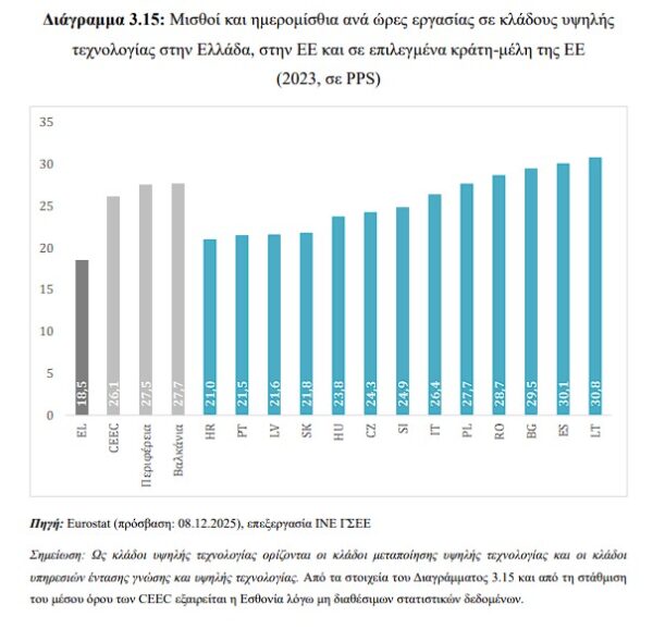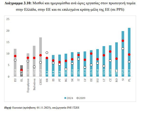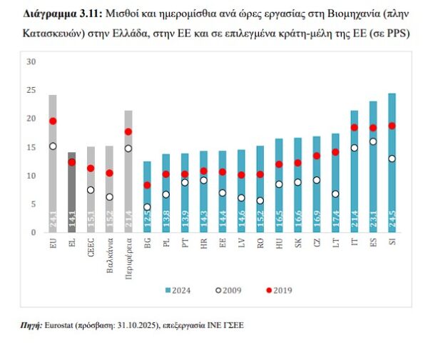 Σε ότι αφορά τις συνθήκες υποαμοιβής των μισθωτών στη χώρα μας, το 2024 στους κλάδους της Βιομηχανίας (πλην Κατασκευών) το μέσο ωρομίσθιο σε όρους PPS διαμορφώθηκε σε 14,1, όταν στις χώρες της Κεντρικής και Ανατολικής Ευρώπης ήταν 15,1, στα κράτη-μέλη των Βαλκανίων 15,2 και στις οικονομίες της Περιφέρειας 21,4.