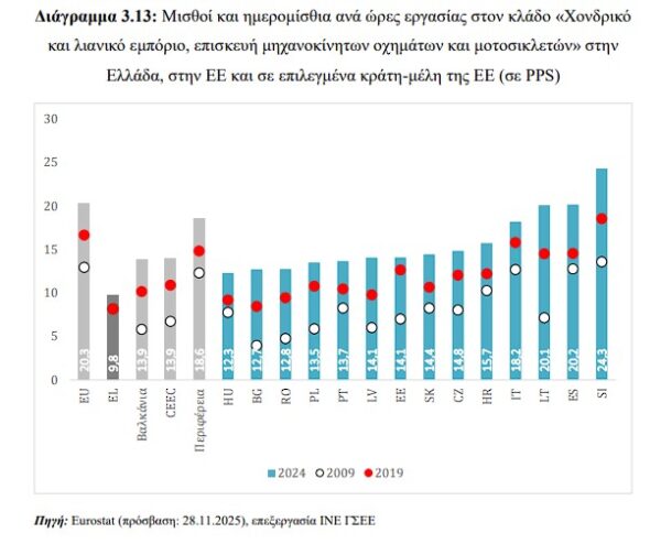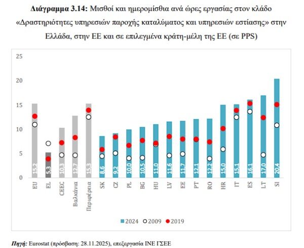 • Σημειώνεται ότι οι συνθήκες υποαμοιβής των μισθωτών στη χώρα μας σε σχέση με τις υπόλοιπες υπό εξέταση οικονομίες της ΕΕ είναι οριζόντιες, καλύπτοντας σχεδόν όλους τους τομείς οικονομικής δραστηριότητας. Ενδεικτικά, το 2024 στους κλάδους της Βιομηχανίας (πλην Κατασκευών) το μέσο ωρομίσθιο σε όρους PPS στην Ελλάδα διαμορφώθηκε σε 14,1, όταν στις χώρες της Κεντρικής και Ανατολικής Ευρώπης ήταν 15,1, στα κράτη-μέλη των Βαλκανίων 15,2 και στις οικονομίες της Περιφέρειας 21,4. Επίσης, το ίδιο έτος στις υπηρεσίες οι ωριαίες αποδοχές των μισθωτών στην Ελλάδα σε όρους PPS αντιστοιχούσαν μόλις στο 72% του αντίστοιχου μέσου επιπέδου των χωρών της Κεντρικής και Ανατολικής Ευρώπης, στο 56,5% των κρατών-μελών των Βαλκανίων και στο 54,4% των οικονομιών της Περιφέρειας. Αξίζει επίσης να σημειωθεί ότι σημαντικές μισθολογικές αποκλίσεις μεταξύ Ελλάδας και άλλων κρατών-μελών της ΕΕ παρατηρούνται ακόμη και σε κλάδους, στους οποίους η χώρα μας εμφανίζει σχετικά υψηλή συγκέντρωση απασχόλησης, όπως ο κλάδος «Χονδρικό και λιανικό εμπόριο, επισκευή μηχανοκίνητων οχημάτων και μοτοσικλετών» και ο κλάδος «Δραστηριότητες υπηρεσιών παροχής καταλύματος και υπηρεσιών εστίασης».