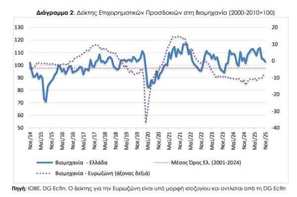 Μικρή υποχώρηση των προσδοκιών σε βιομηχανία και υπηρεσίες τον Νοέμβριο, και βελτίωση σε λιανικό εμπόριο και κατασκευές, δείχνει η σχετική μελέτη του Ιδρύματος Οικονομικών και Βιομηχανικών Ερευνών (ΙΟΒΕ).