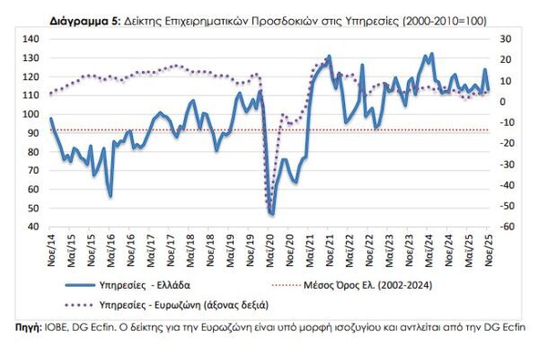 Ο Δείκτης Επιχειρηματικών Προσδοκιών στις Υπηρεσίες υποχώρησε έντονα τον Νοέμβριο, στις 113,3 μονάδες, από 123,9 τον Οκτώβριο. Από τις επιμέρους μεταβλητές του δείκτη, οι θετικές