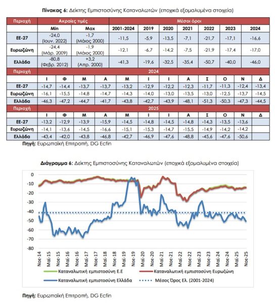 σε ΕΕ και Ευρωζώνη διαμορφώθηκαν στις -24,7 και -26,2 μονάδες αντίστοιχα.