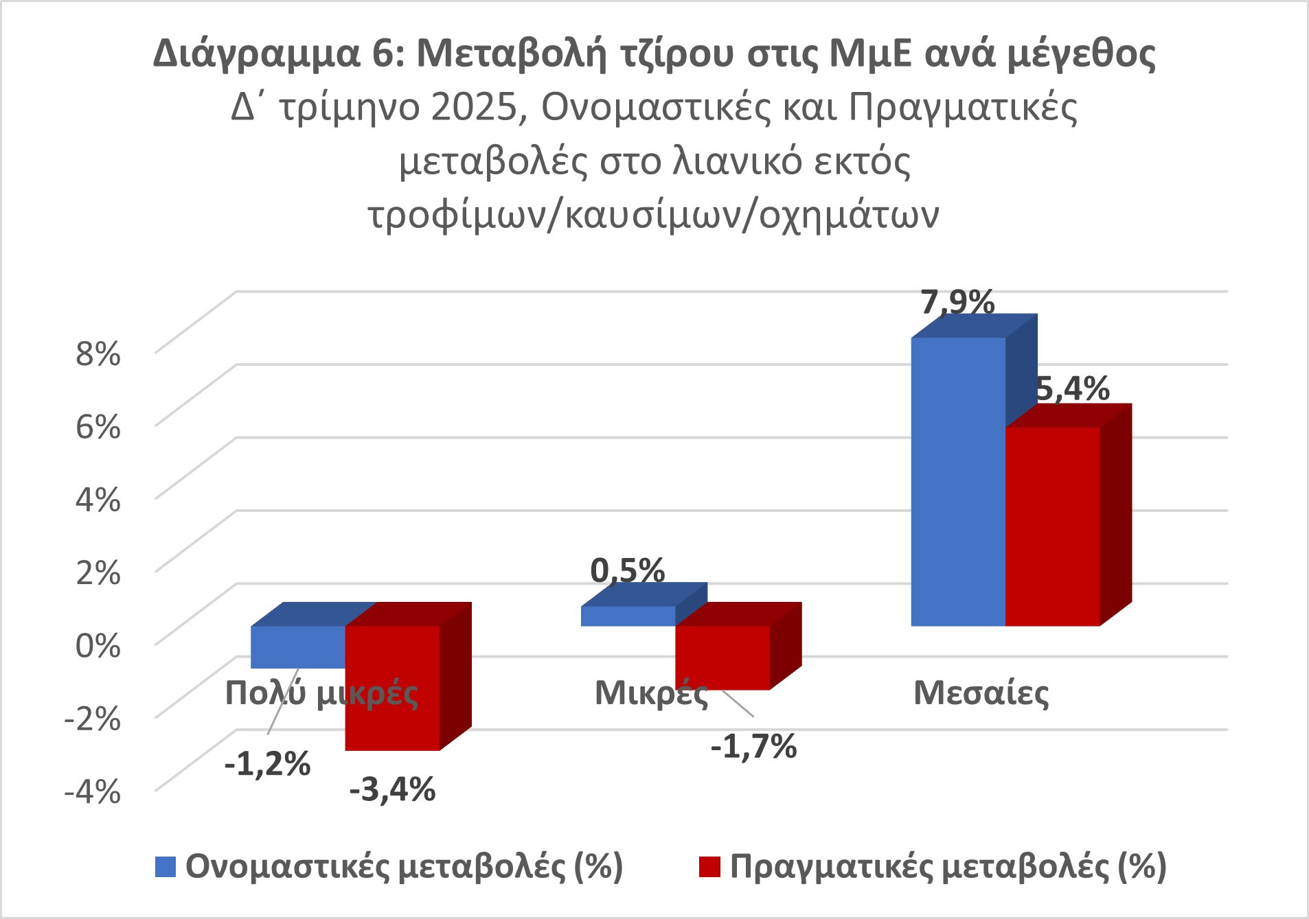 - Οι μικρές επιχειρήσεις φαίνεται να πιέζονται περισσότερο καθώς, σε πραγματικές τιμές, η πτώση στον τζίρο ανήλθε σε 3,9%[-1,5%].