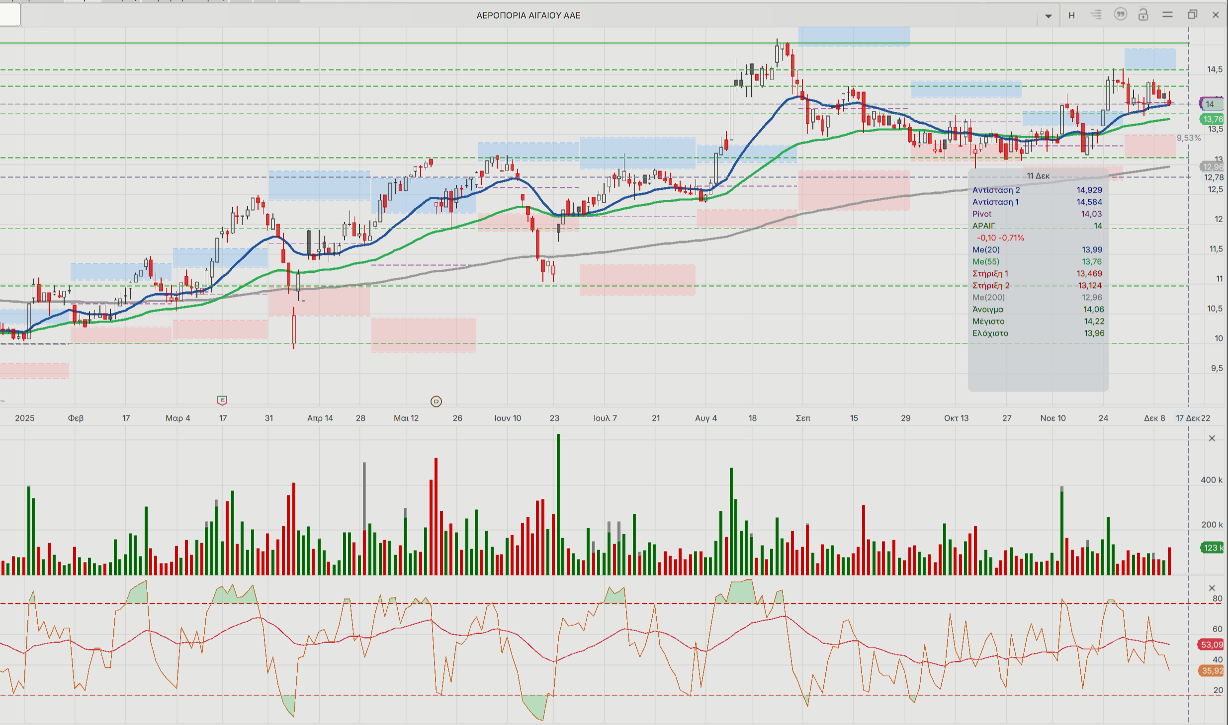 Για τον τίτλο της Aegean, η στήριξη του κινητού μέσου όρου των 200 ημερών είναι κρίσιμη, με τα επίπεδα να βρίσκονται στα 13 ευρώ περίπου. Τα 13 ευρώ αποτελούν σημαντική περιοχή στήριξης και ως Fibonacci επίπεδο, συνεπώς έχει ισχυρή βαρύτητα στο τρέχον ανοδικό κύμα. Ο πρώτος στόχος είναι επίσης λίγο πάνω από τα 15 ευρώ, όπως και στην περίπτωση της Σαράvτης, ενώ και ο απώτερος στόχος για το 2027 συμπίπτει στα 18 ευρώ.