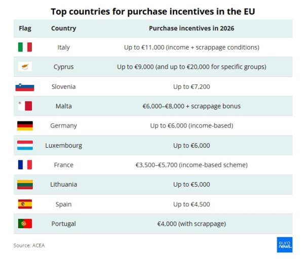 Μεταξύ των χωρών που προσφέρουν τα υψηλότερα κίνητρα αγοράς, η Ιταλία χορηγεί έως 11.000 ευρώ, ανάλογα με το εισόδημα και τους όρους απόσυρσης, ενώ η Κύπρος προσφέρει έως 9.000 ευρώ για όχημα και έως 20.000 ευρώ για συγκεκριμένες κατηγορίες. Η Σλοβενία παρέχει έως 7.200 ευρώ και η Μάλτα από 6.000 έως 8.000 ευρώ, συν μπόνους απόσυρσης.