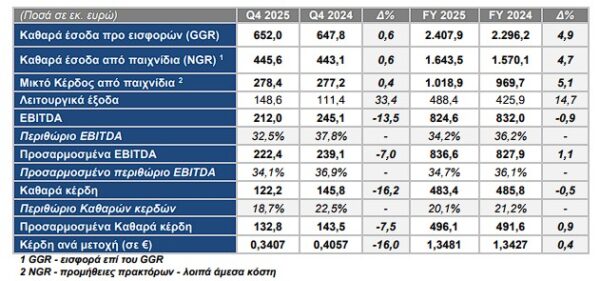 • Τα καθαρά έσοδα προ εισφορών (GGR) χρήσης 2025 αυξήθηκαν σε νέα επίπεδα ρεκόρ στα €2.407,9εκ. έναντι €2.296,2εκ. το 2024, αυξημένα κατά 4,9% σε ετήσια βάση, ως αποτέλεσμα της ισχυρής ανάπτυξης τόσο στο online όσο και την επίγεια δραστηριότητα (retail). Το δ’ τρίμηνο 2025 τα καθαρά έσοδα ανήλθαν σε €652,0εκ., σημειώνοντας αύξηση 0,6% σε ετήσια βάση, με ισχυρή επίδοση των VLTs (+9,2%) και του iGaming (online καζίνο, +16,2%).