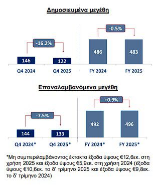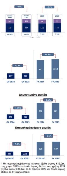 • Τα κέρδη προ τόκων, φόρων και αποσβέσεων (EBITDA) το 2025 σημείωσαν μικρή μείωση κατά 0,9% σε ετήσια βάση στα €824,6εκ. (χρήση 2024: €832,0εκ.), ή στα €836,6εκ. σε επαναλαμβανόμενη βάση (+1,1% σε ετήσια βάση). Τα EBITDA δ’ τριμήνου 2025 ανήλθαν σε €212,0εκ. (δ’ τρίμηνο 2024: €245,1εκ.), μειωμένα κατά 13,5% σε ετήσια βάση ή σε €222,4εκ. (-7,0%) σε επαναλαμβανόμενη ετήσια βάση, επηρεασμένα από τα υψηλότερα λειτουργικά έξοδα.