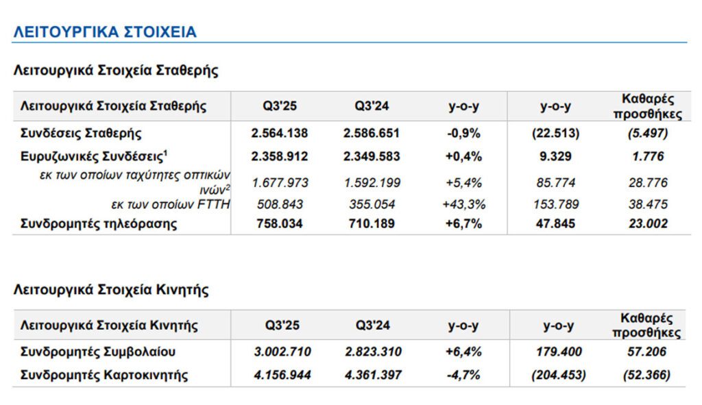 Τα οικονομικά αποτελέσματα για το γ’ τρίμηνο του 2025, ανακοίνωσε ο ΟΤΕ. Σύμφωνα με αυτά, παρουσίασε αυξημένες πωλήσεις 5%, ενώ ανακοίνωσε και έκτακτη διανομή 40 εκατ. στους μετόχους. Παράλληλα, σημείωσε ισχυρή ανάπτυξη στην κινητή με αύξηση 2,7% στα έσοδα από υπηρεσίες και 6,4% στους πελάτες συμβολαίου, ενώ παρουσίασε και σημαντική ετήσια εξοικονόμηση εφεξής ελεύθερων ταμειακών ροών (FCF).