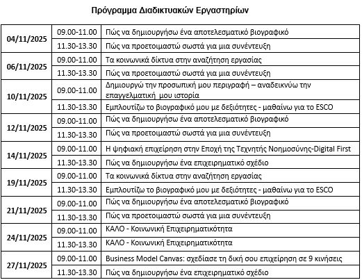 Τα 18 διαδικτυακά e-Εργαστήρια διάρκειας 2 ωρών θα πραγματοποιηθούν από εργασιακούς συμβούλους στις ημερομηνίες του παρακάτω πίνακα.