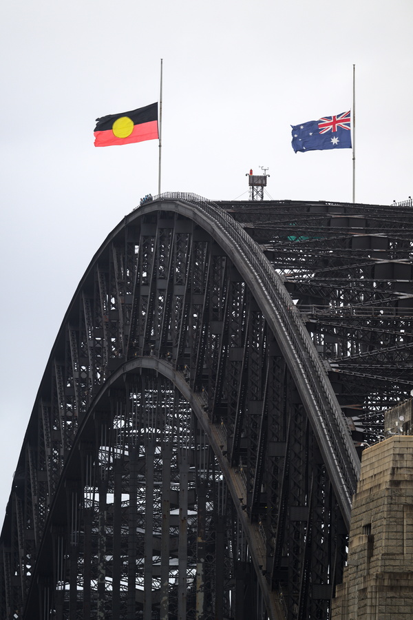 Flags fly at half mast on the Sydney Harbour Bridge in Sydney, Australia, 15 December 2025. Australia is in mourning after gunmen opened fire on Bondi Beach, killing at least 15 people EPA/STEVEN MARKHAM AUSTRALIA AND NEW ZEALAND OUT