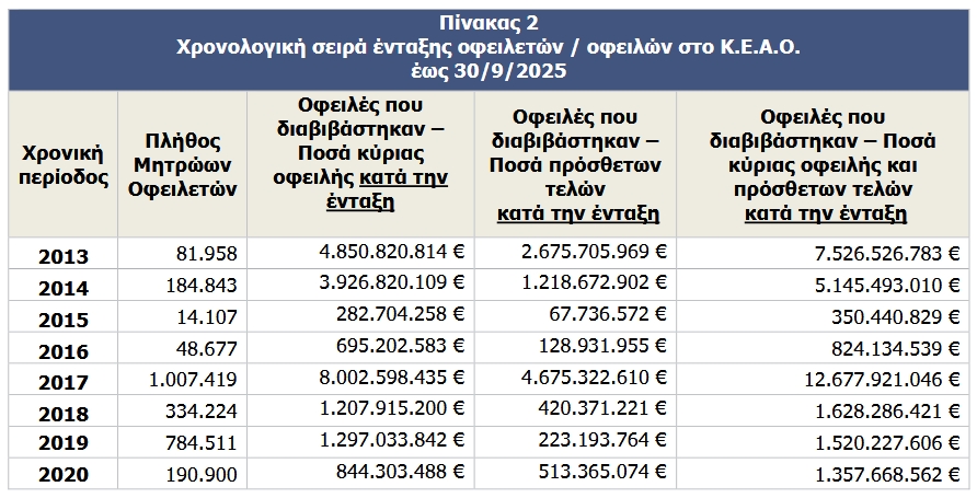 Στο τέλος του Σεπτεμβρίου 2025 το συνολικό ποσό των 32.333.452.811 € σε οφειλές (22.182.687.799 € κύρια οφειλή και 10.150.765.013 € πρόσθετα τέλη) που έχουν ενταχθεί στο Κ.Ε.Α.Ο. διαμορφώθηκε στα 50.682.612.587 € (τρέχον υπόλοιπο, εκ των οποίων 29.843.270.715 € κύρια οφειλή και 20.839.341.872 € πρόσθετα τέλη).