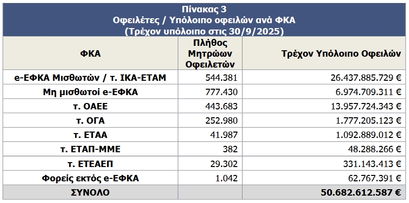 Στον πίνακα που ακολουθεί παρουσιάζεται το τρέχον υπόλοιπο οφειλών ανά ΦΚΑ, όπως έχει διαμορφωθεί στο τέλος Σεπτεμβρίου 2025.