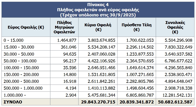 Στον πίνακα που ακολουθεί παρουσιάζεται το τρέχον υπόλοιπο οφειλών ανά εύρος οφειλής.
