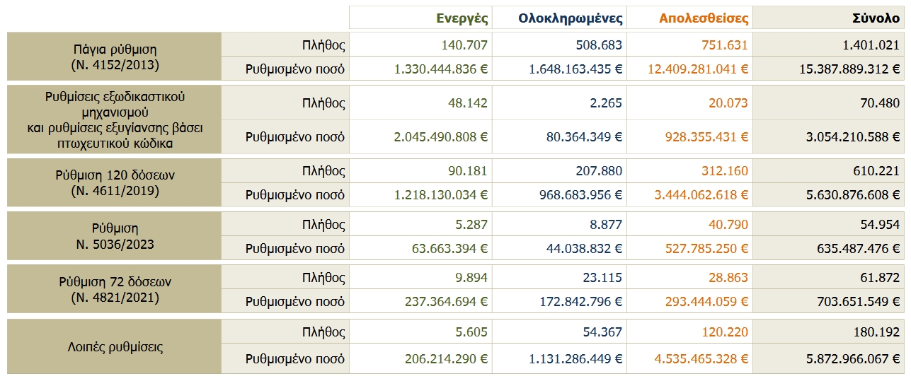 Στο τέλος Σεπτεμβρίου 2025 οι συνολικές ενεργές ρυθμίσεις ήταν 299.816 και το ρυθμισμένο ποσό 5.101.308.055 €, ενώ οι ολοκληρωμένες ρυθμίσεις ήταν συνολικά 805.187 για οφειλές στο Κ.Ε.Α.Ο. ύψους 4.045.379.818 €.