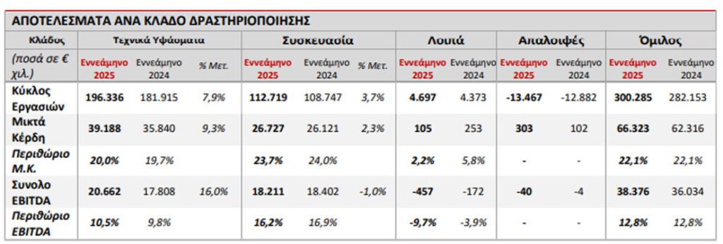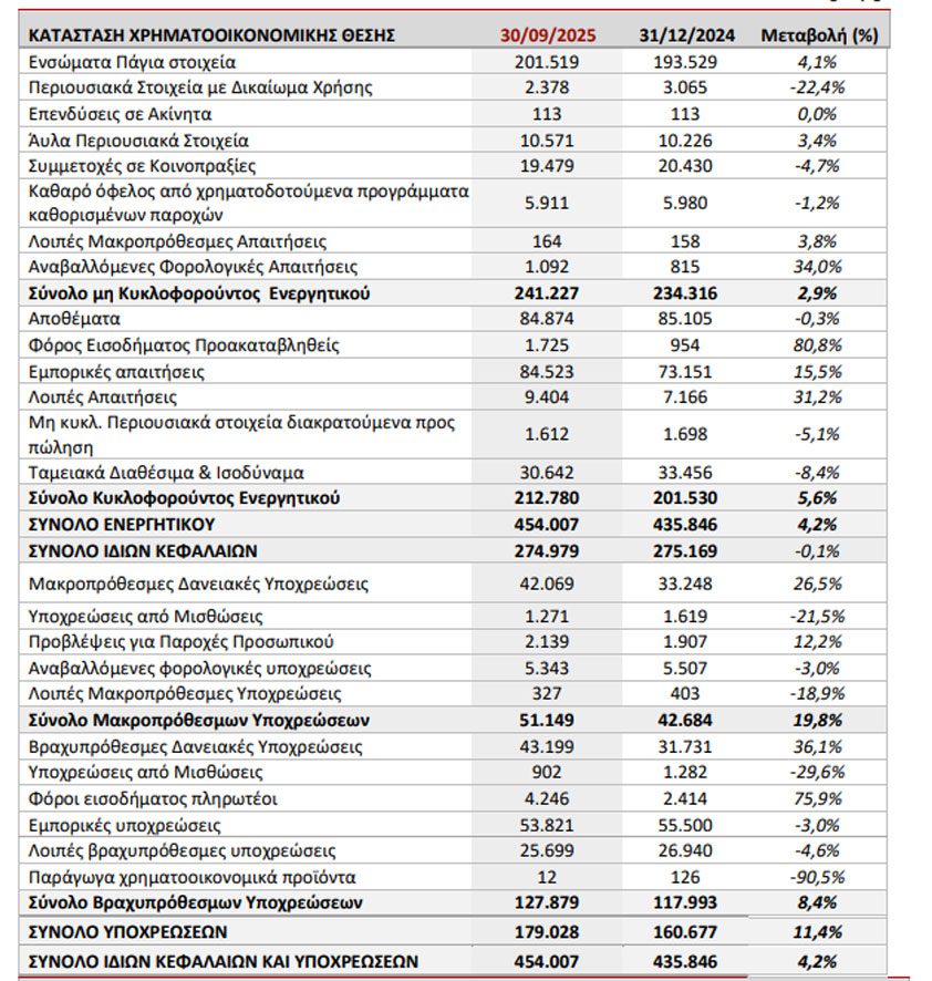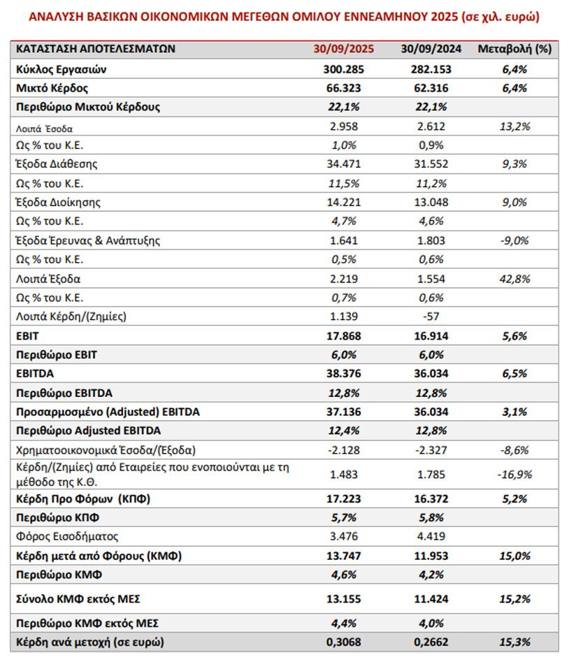 Ειδικότερα, στον πίνακα παρουσιάζονται τα βασικά οικονομικά μεγέθη του Ομίλου για το εννεάμηνο του 2025, σε σχέση με την αντίστοιχη περίοδο του 2024: