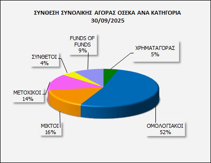 - Στις 30.09.2025, η συνολική αγορά των Ο.Σ.Ε.Κ.Α. που διαχειρίζονται ελληνικές Α.Ε.Δ.Α.Κ. παρουσίασε αύξηση του συνολικού ενεργητικού κατά 6,6% από το προηγούμενο τρίμηνο και 26,6% από την αρχή του έτους με το συνολικό ύψος των υπό διαχείριση κεφαλαίων να διαμορφώνεται σε €28 δισ. (Ο.Σ.Ε.Κ.Α. ν.4099/12 €21,79 δισ. αύξηση 22% και Ο.Σ.Ε.Κ.Α. Ε.Ε. €6,23 δισ. αύξηση 46% από την αρχή του έτους).