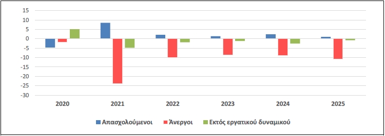 Γράφημα 2: Ετήσιες μεταβολές απασχολουμένων, ανέργων και ατόμων εκτός εργατικού δυναμικού