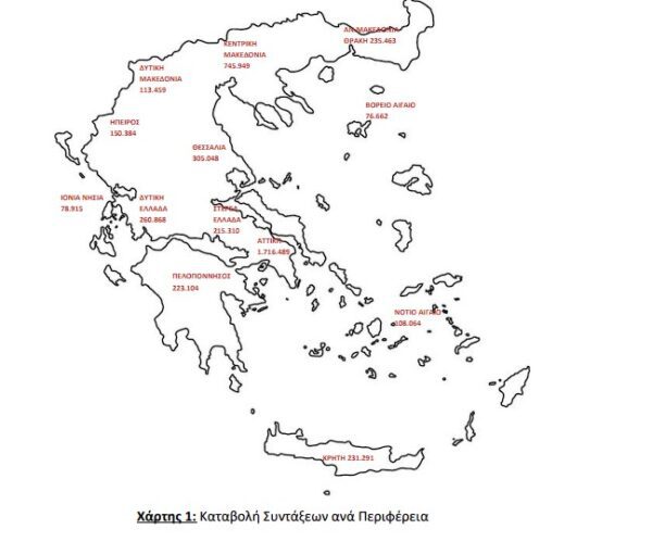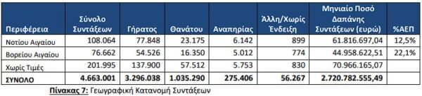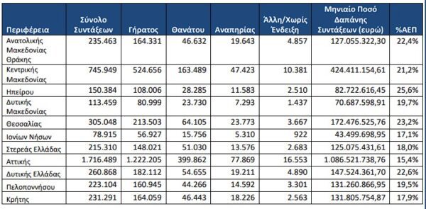 Όπως προκύπτει από την επεξεργασία του πεδίου του ταχυδρομικού κώδικα των δικαιούχων στα αρχεία των συντάξεων, ο μεγαλύτερος αριθμός συντάξεων καταβάλλεται στην Αττική (1.716.489) και την Κεντρική Μακεδονία (745.949). Ακολουθεί η Θεσσαλία με 305.048συντάξεις και η Δυτική Ελλάδα με 260.868. Στην Περιφέρεια Ηπείρου παρατηρείται η μεγαλύτερη τιμή (25,6%) του λόγου ποσού σύνταξης προς ΑΕΠ και ακολουθεί η Περιφέρεια Θεσσαλίας με τιμή 23,2%. Στην τελευταία θέση βρίσκεται η Περιφέρεια Νοτίου Αιγαίου με τιμή 12,5%.